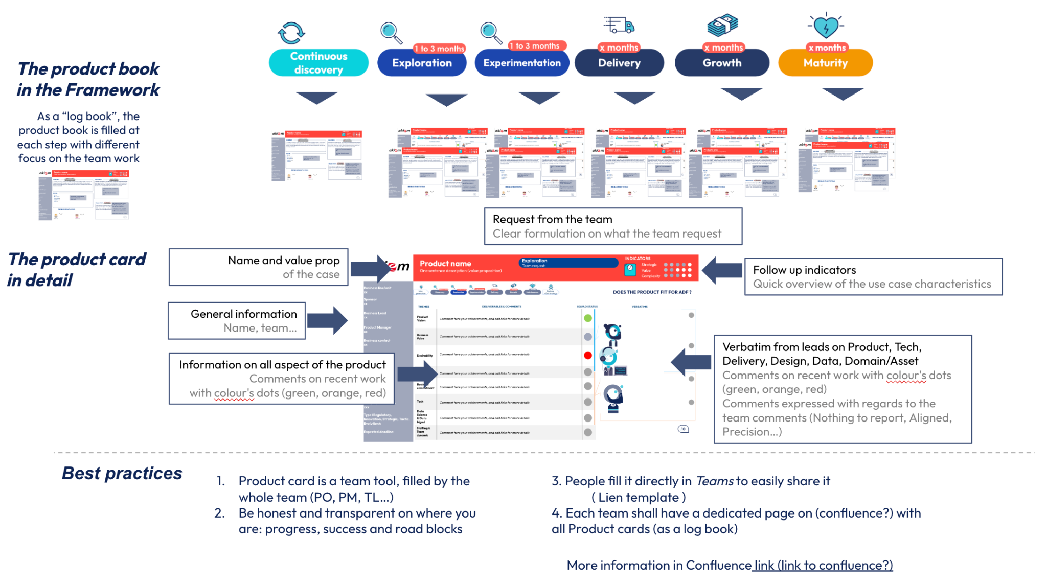 - Fiche produit : pitch, sponsor, équipe, vision, carte d’expérience, indicateurs…