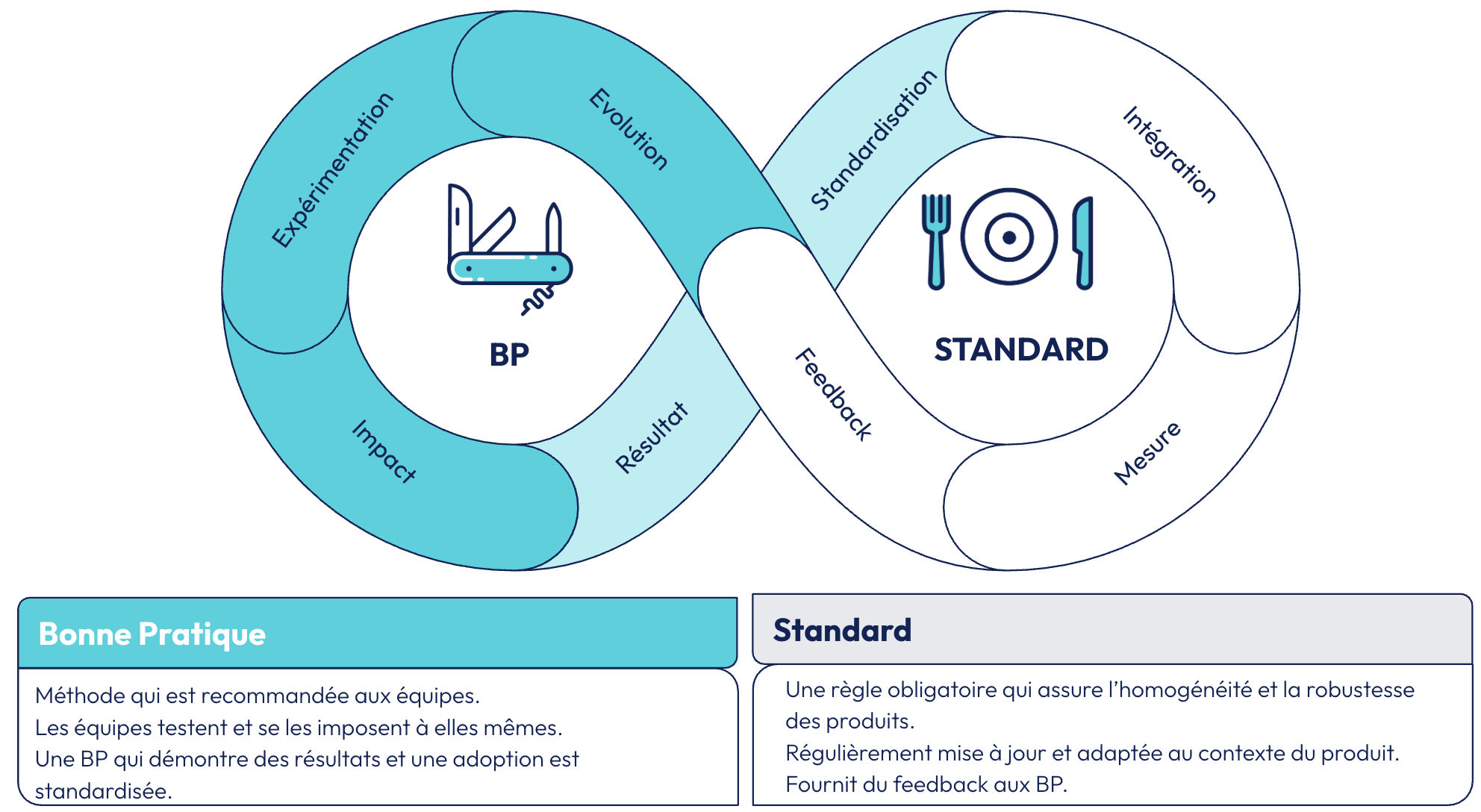 - Le standard: une façon de faire qui rentre dans les critères de passage du golden path. Le standard peut avoir plusieurs niveaux d’implémentation mais il reste une obligation.