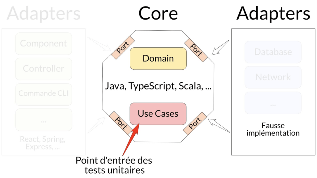 Un TU a en point d’entrée un Use Case à qui on va masquer des problématiques qui vont être du ressort des Adaptateurs, afin de se concentrer sur ce qui est présent dans le Core****.