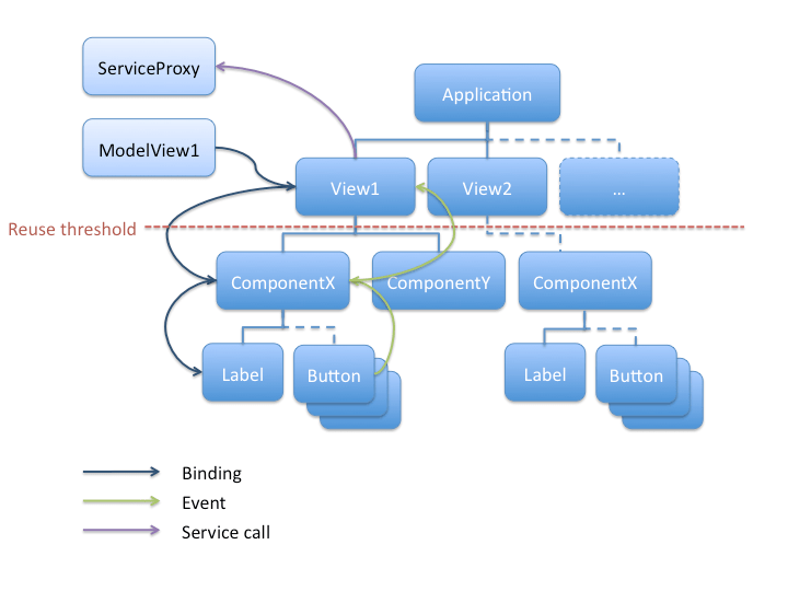 Les nœuds de l'arbre étant des composants conteneurs (*Box, Canvas, List, ...) contenant d'autres composants plus primitifs (Label, Button, ...) ou d'autres conteneurs. Avec une séparation entre le modèle et les appels de services et la vue, il reste que n'importe quel composant peut se binder sur le modèle de données et peut effectuer un appel de service. Ce composant n'est alors plus réutilisable dans un autre contexte : il dépend des données sur lesquelles il est bindé et ne peut plus être utilisé pour en afficher d'autres. Pour lever cette limite, il faut que les données sur lesquelles il se binde lui soit injectées. De même pour les appels de services, pour que le composant puisse être utilisé dans un autre contexte (qui nécessite l'appel d'un autre service ou qui ne nécessiterait pas d'appel du tout), il faut supprimer la dépendance vers cet appel de service (ie. le composant ne devrait même pas "savoir" qu'un appel est effectué lorsqu'un événement intervient).