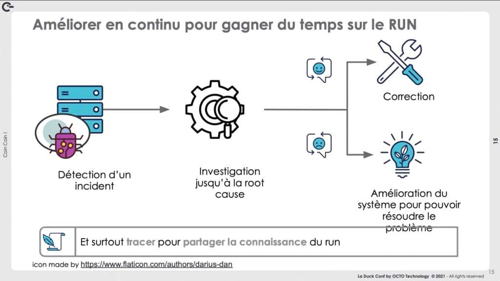 Enfin, il y a forcément des problématiques en production. La posture adoptée a été de ne pas les laisser traîner et de mettre en place une démarche d'amélioration continue sur le run avec, à chaque bug, un processus clairement défini :