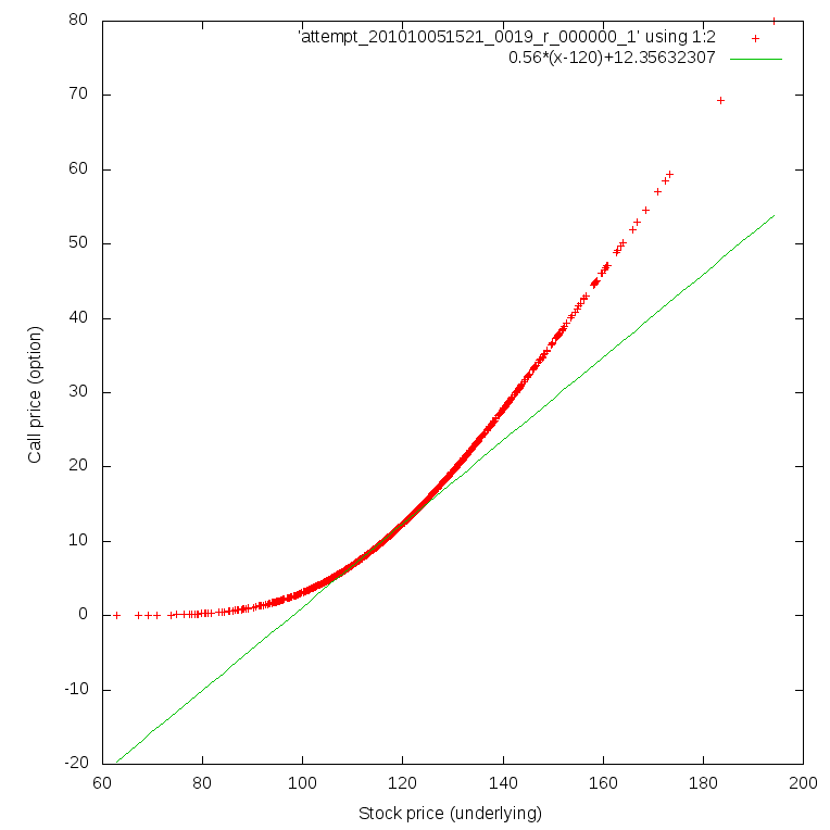 gnuplot -e 'set terminal png size 764,764; set output "call.png"; set xlabel "Stock price (underlying)"; set ylabel "Call price (option)"; plot "HiveOutput/output.txt" using 1:2, 0.56*(x-120)+12.35632307; exit;'