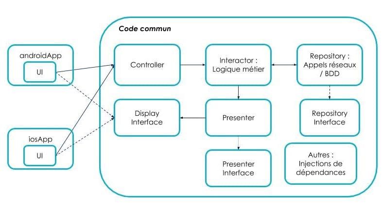 Mutualiser toutes ces parties nous laisse principalement l’interface graphique qui est codée nativement dans chaque plateforme. Mais on peut aller plus loin en introduisant une architecture telle que Viper ou la clean architecture afin de mieux organiser notre bibliothèque. Toutes les notions mutualisables seront réparties dans les différentes composantes de l’architecture choisie.