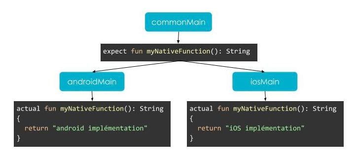 Expect est un mot clé qui sera utilisé à côté d’une déclaration de fonction ou de variable se trouvant dans le dossier commonMain et qui fait appel à son implémentation se trouvant dans iosMain et androidMain dont le nom est le même et qui contient le mot clé Actual.