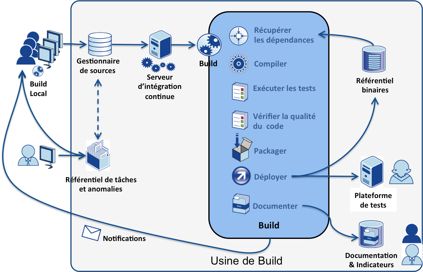 - L’équipe de développement : Elle produit le code et l’usine permet d'automatiser les étapes du build.