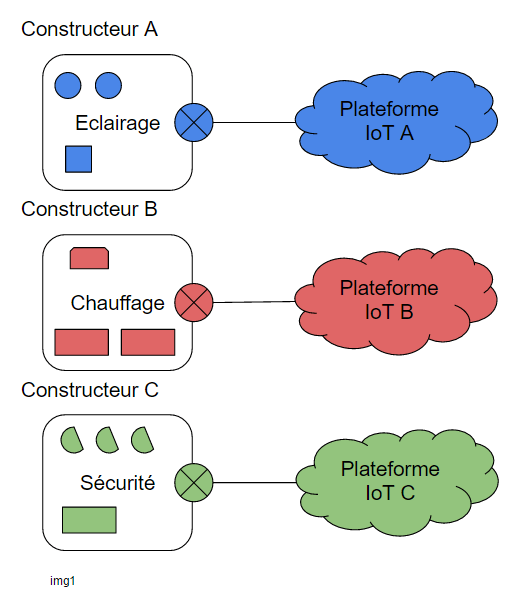 L’Internet des objets est principalement réalisé par des constructeurs de matériel/logiciel intégrant leurs produits de manière fermée. La figure suivante montre les objets d’un même constructeur, interopérables entre eux, enfermés dans une bulle de communication délimitée par une passerelle. Cette passerelle est souvent reliée à un service SaaS propriétaire dans le cloud qui traite et expose tout ou partie des données. Ce service cloud étant réalisé grâce à des systèmes appelés “plate-forme IoT”.