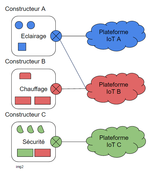Cette architecture a l’énorme avantage de fixer la responsabilité sans équivoque du constructeur sur le bon fonctionnement du système qu’il livre (objet/passerelle/plate-forme IoT Cloud). La contrepartie est que le client est enfermé dans la solution du constructeur. A titre d'exemple, dans le domaine des équipements électriques professionnels, les grands constructeurs (Schneider, Siemens…) appliquent cette stratégie de systèmes fermés depuis toujours. Dans le monde de l’électronique grand public, il en va de même avec des offres comme Nest de Google, Hue de Philips… En fonction de leur influence, les constructeurs invitent les autres offres à s’interconnecter à la leur et les considèrent comme des périphériques. Google Nest, se présente ainsi comme un intégrateur des solutions tierces et revendique de pouvoir contrôler des lampes Philips Hue. La figure suivante montre des modes d’encapsulation différents, l’un en passant par leurs offres cloud, l’autre par intégration des objets d’un tiers dans son système.
