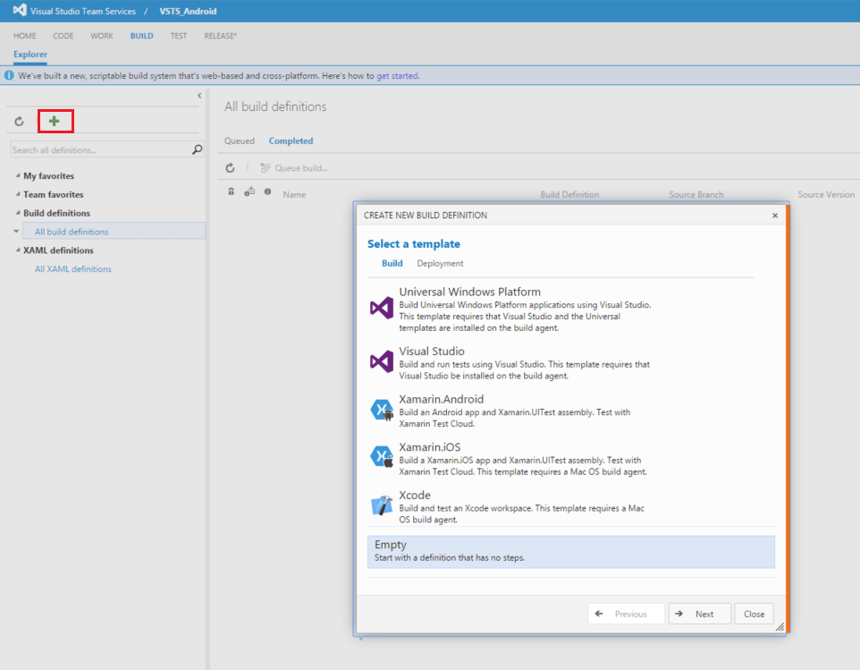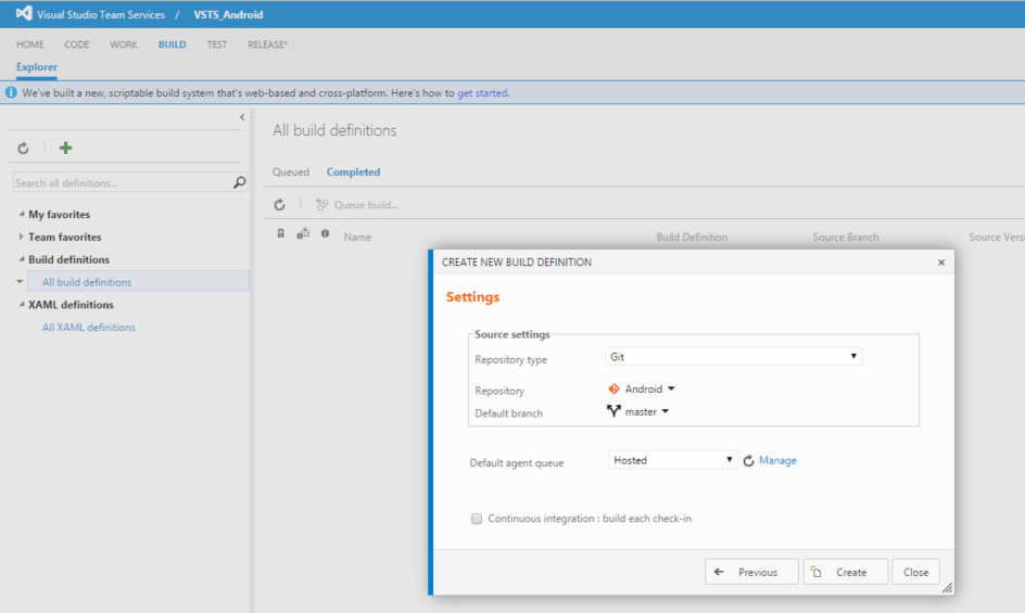 Une fois notre projet créé, nous allons pouvoir nous attaquer à la partie processus de compilation (build definition). Pour cela, rendons-nous sur le portail de notre projet, dans l'onglet "Build". Et créez une nouvelle "Build definition".