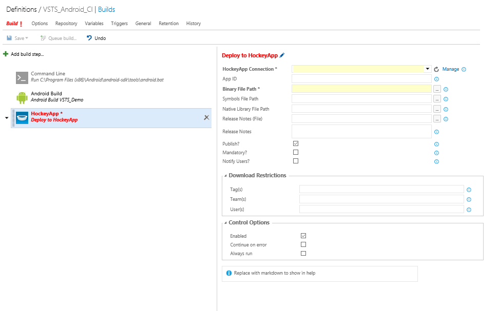 Vous pouvez ensuite sauvegarder la tâche (pensez bien à la mettre à la toute fin du projet de build). Si tout se passe bien, vous devriez voir apparaître votre application sur le portail HockeyApp.