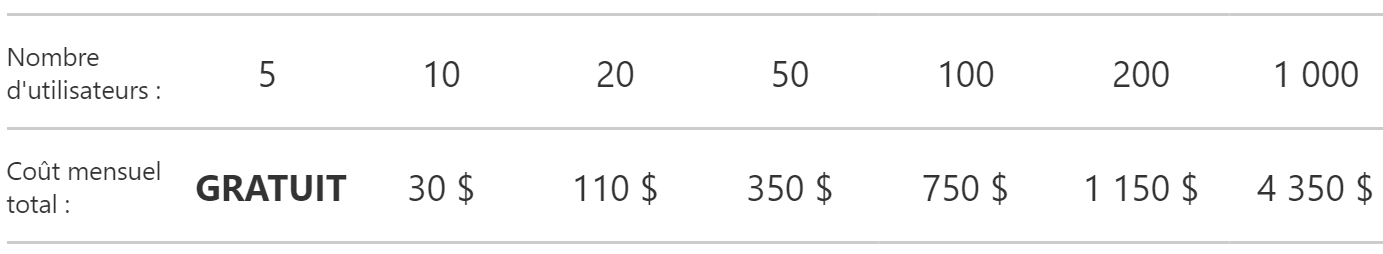Côté prix, l'outil est gratuit jusqu'à 5 utilisateurs, ce qui peut vous permettre de vous faire rapidement une idée. La fiche tarifaire propose des prix mensuels par palier aux nombres d'utilisateurs.