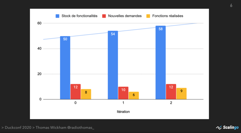 Mise en situation. Je viens d’être nommé chef de projet dans ma big company sur un projet XXL structurant et stratégique. Mais tout ne se passe pas comme prévu, on a de plus en plus de fonctionnalités en stock comme le montre le tableau que j'utilise pour gérer mon projet et les retards s’accumulent.