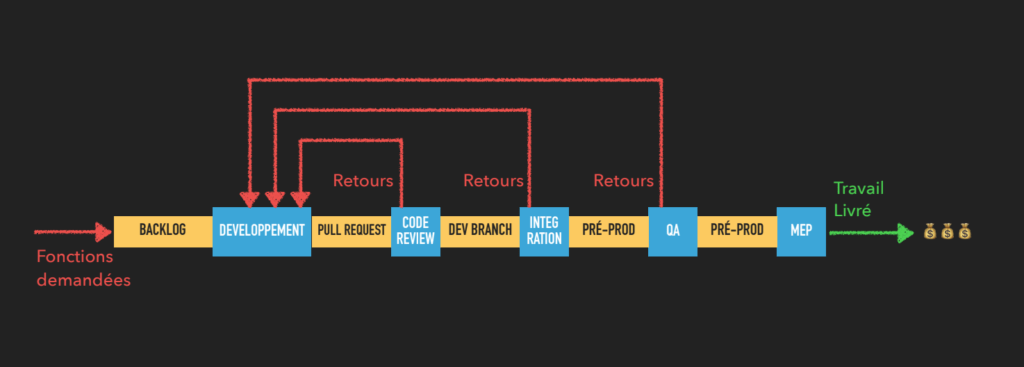 - le code ne passe pas directement en pré-prod, il y a des allers- retours au stade de la revue de code si jamais ce n’est pas conforme aux standards de l’équipe