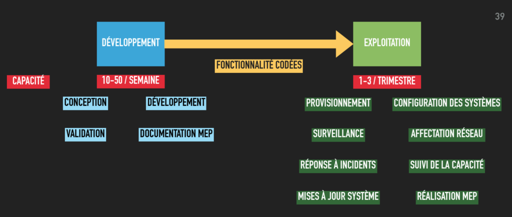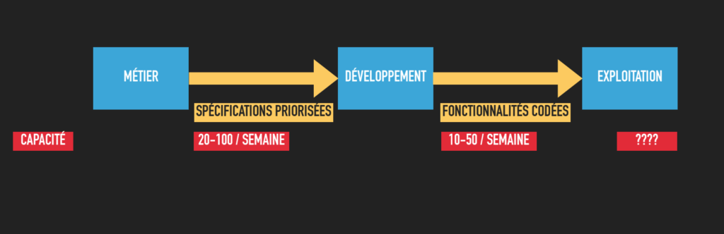 Au niveau métier, c’est “facile” d’ajouter de nouvelles de spécifications et d’alimenter le flux entrant. On a mesuré la capacité de production de l’équipe de développement, mais qu’en est-il de mon équipe chargée de l’exploitation ? Ne serait-elle pas le facteur limitant de l’équipe ?
