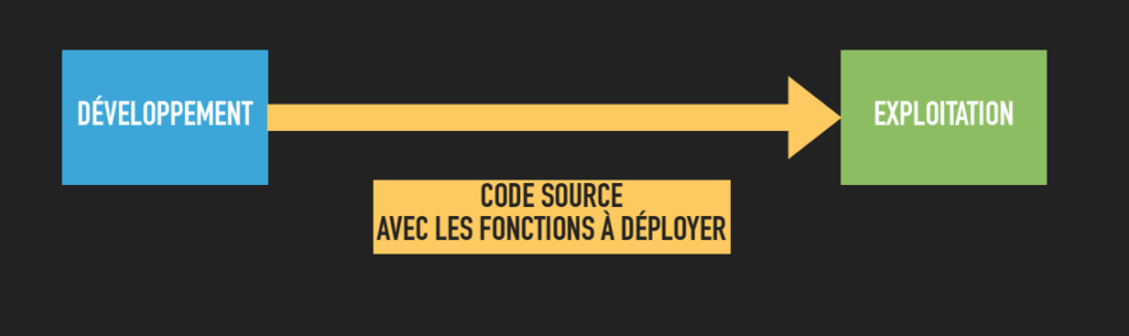 Les devs poussent le code source en local, puis le passent à l'exploitation avec les fonctions à déployer. L’exploitation s’occupe des mise à jours, des images dockers, etc.