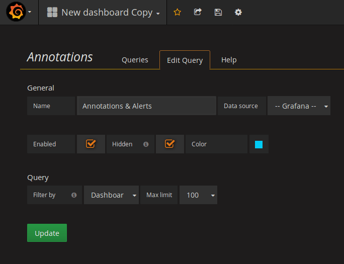 Since the built-in query will only display the annotations explicitly scoped to the dashboard we need to add a new query that will be able to display our global annotations.
