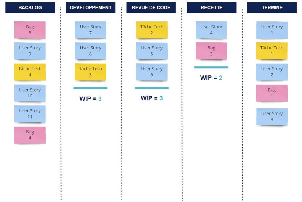 Les WIP limits sont une composante de Kanban. Kanban est un framework d’amélioration continue issu de la pensée Lean. Il vise à équilibrer capacité et demande dans un système complexe**[1]**. Kanban propose notamment de visualiser son flux de travail, souvent sous la forme d’un tableau où chaque colonne est une étape d’un processus - de production de software dans notre cas. Sur ce tableau se déplacent de gauche à droite des tickets figurant un incrément de code (un apport de valeur (User Story - US), une correction (Bug), une tâche technique, etc.).