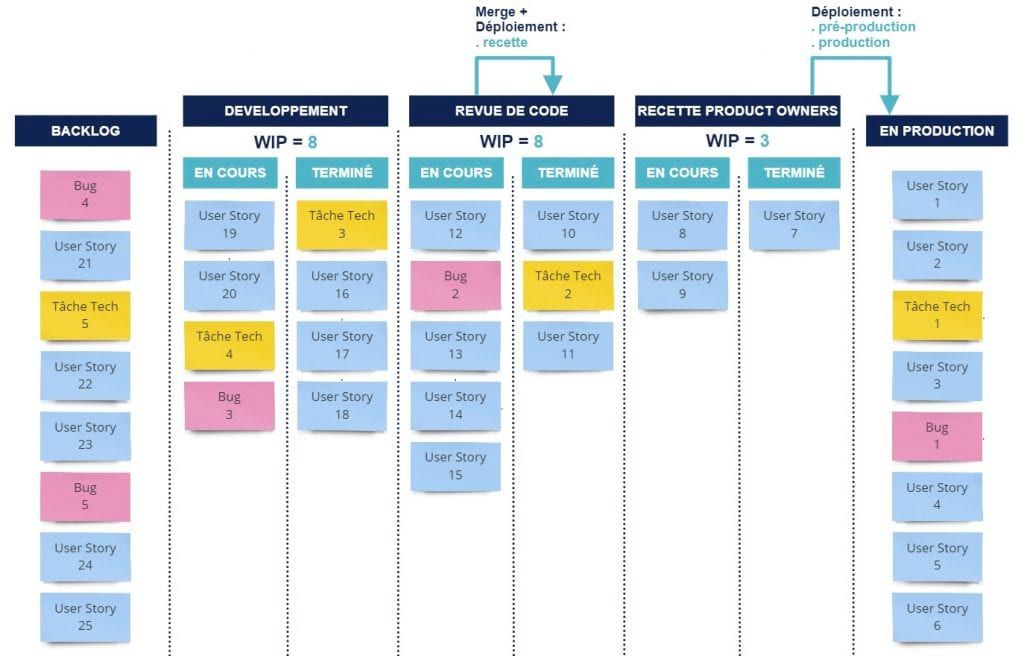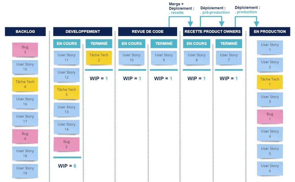 __________________________ [1] Cf. framework Cynefin ↩ [2] Stop Starting, Start Finishing! Arne Roock and Claudia Leschik. (USA: Lean-Kanban University, 2012). ISBN 978-0985305161 ↩ [3] Merger : action d’incorporer le code nouvellement développé dans la base de code commune du projet (master). ↩ [4] Master : base de code commune dans laquelle le code correspondant à chaque ticket développé doit être incorporé (mergé). ↩ [5] Rétrospective : Rituel agile consistant à une introspection collective permettant notamment d’identifier des pistes d’amélioration continue. ↩ [6] Rebase : Action de récupérer la base de code commune (master) à jour avant d’y incorporer de nouveaux développements (de merger). Si du code a été ajouté à la base commune (master) entre le début de mes développements et leur fin, un rebase me permet de m’assurer que mes développements s'incorporeront correctement dans la base de code à jour. ↩ [7] DOD - Definition Of Done : Ensemble des conditions devant être remplies pour qu’un ticket passe d’une colonne à l’autre. ↩
