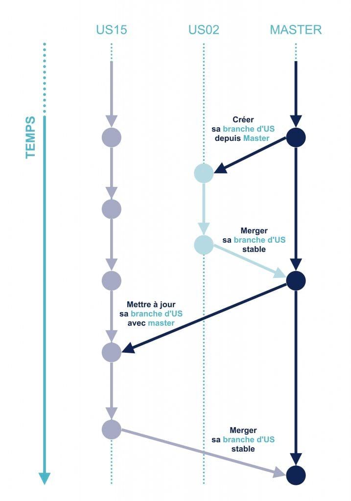 Ce qui signifie que le code développé pour chaque ticket doit être mergé**[3]** sur master**[4]** pour être testé sur l'environnement de recette ; puis le même build (la même version de l'application) est déployé sur les environnements de pré-production et de production.