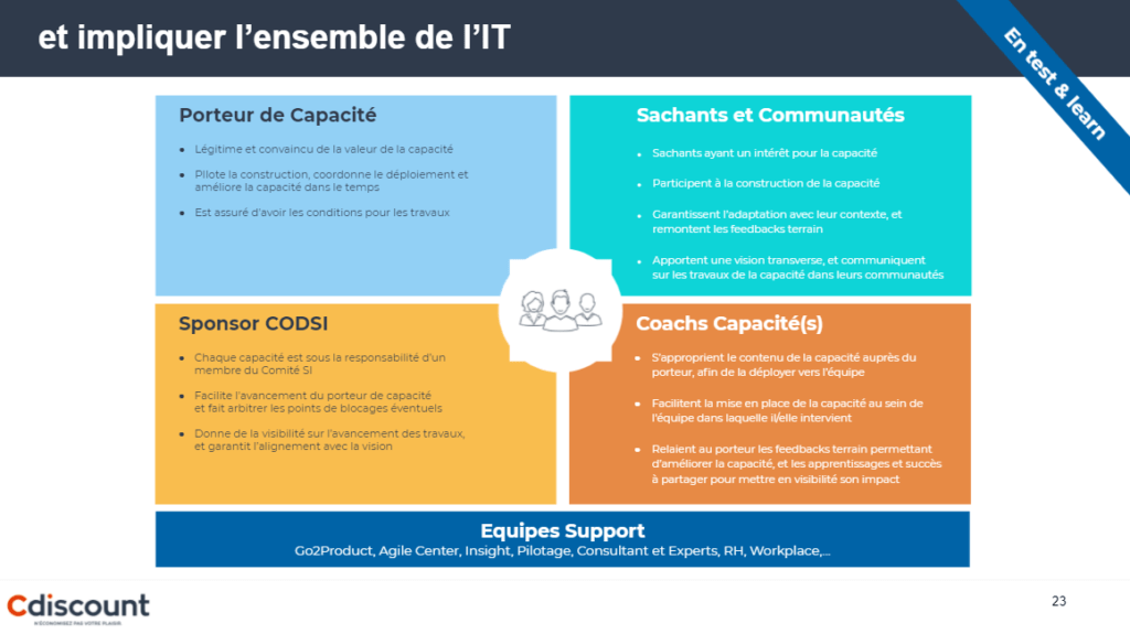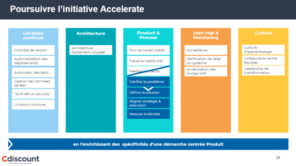 Cdiscount poursuit son chemin vers une organisation produit à l'état de l'art et tiré par Accelerate. En ce moment même, les capacités sont testées et déployées. Plus de 13 équipes pilotes sont accompagnées pour acquérir le socle 1 et devenir des équipes produits “constantes dans le temps, autonomes, responsables de leurs assets, obsédées par la mesure, agiles, rapides et centrées utilisateurs”. Et Christophe Samson nous l’assure, il y croit !