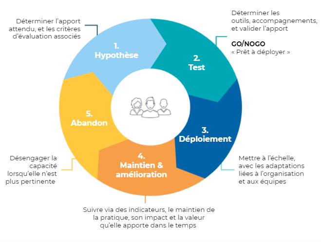 Pour faciliter leur déploiement en suivant une approche “Test & Learn”, le cycle de vie suivant a été défini, inspiré par le Lean Startup :