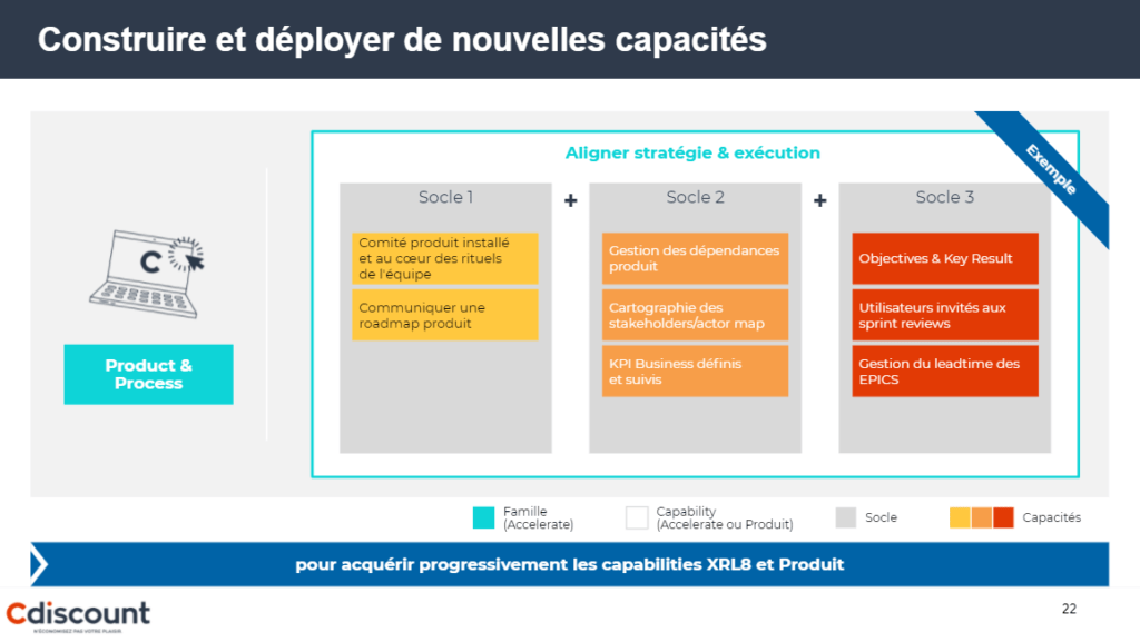 Une des forces d’Accelerate est de proposer 24 capacités (“capabilities”) qui facilitent l’atteinte d’un haut niveau de performance. Cdiscount s’est emparé de ce framework et l’a enrichi, avec l’aide d’OCTO, en développant les capacités produit (en bleu sur le schéma ci-dessous).