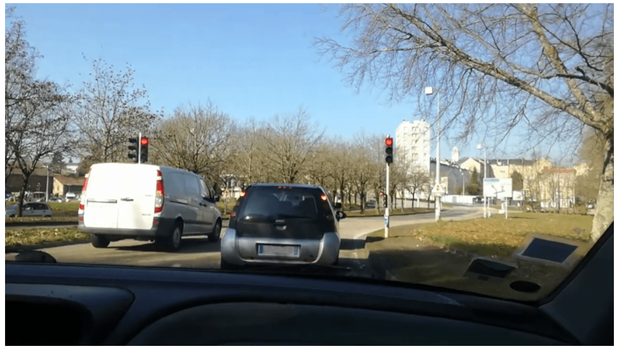 Pour atteindre ce but, nous commençons par installer une caméra dans une voiture en déplacement en agglomération. Nous filmons la route du côté passager de la voiture un jour d’été (dans ce cas pratique, les différentes conditions météorologiques n’ont pas été prises en compte) pendant 2 minutes 30. Puis, au moyen d’un script, nous récupérons une image pour chaque seconde de vidéo, soit au total 150 images. Ci-dessous une image parmi les 150 de notre base de données :