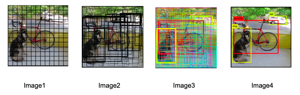 Sur cet exemple, cela paraît simple : la grille est petite, il y a peu d’anchor boxes... Mais en pratique, cela ressemble plutôt à l’image ci-dessous. Dans cette suite d'images, nous remarquons que l’image a été découpée en plusieurs carrés (image 1) qui permettent de générer plusieurs anchor boxes (image 2). L’IoU est ensuite calculé pour regrouper les anchor boxes qui détectent le même objet (nous pouvons le voir à travers les groupes de couleurs sur l’image3). Puis finalement, grâce à l’algorithme de Non-Max Suppression, nous passons de milliers d’anchor boxes à seulement 2 pour détecter un chien et un vélo (image4) :